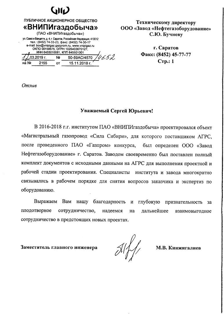 В отзыве указано, что в ходе реализации проекта «Сила Сибири» ООО «Завод «Нефтегазоборудование» своевременно выполнял свои обязательства, активно взаимодействовал с деловыми партнерами в решении возникающих вопросов, а также успешно провел экспертизу поставляемого оборудования.