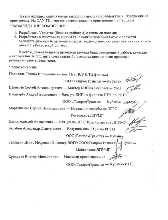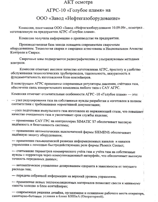 В сентябре 2009 года нашу производственную базу посетили специалисты служб ПО АГРС и КИПиА ООО «Газпром трансгаз - Кубань», ООО «Газпром трансгаз Волгоград» и ООО «Газпром трансгаз Югорск» для ознакомления с АГРС нового поколения «Голубое пламя» производительностью 10.000 нм3/час. Было отмечено высокое качество изготовления АГРС, ее отличительные особенности в сравнении с аналогичными АГРС других производителей, простота и удобство обслуживания технологических трубопроводов, тщательность и фундаментальность изготовления блок-контейнеров.