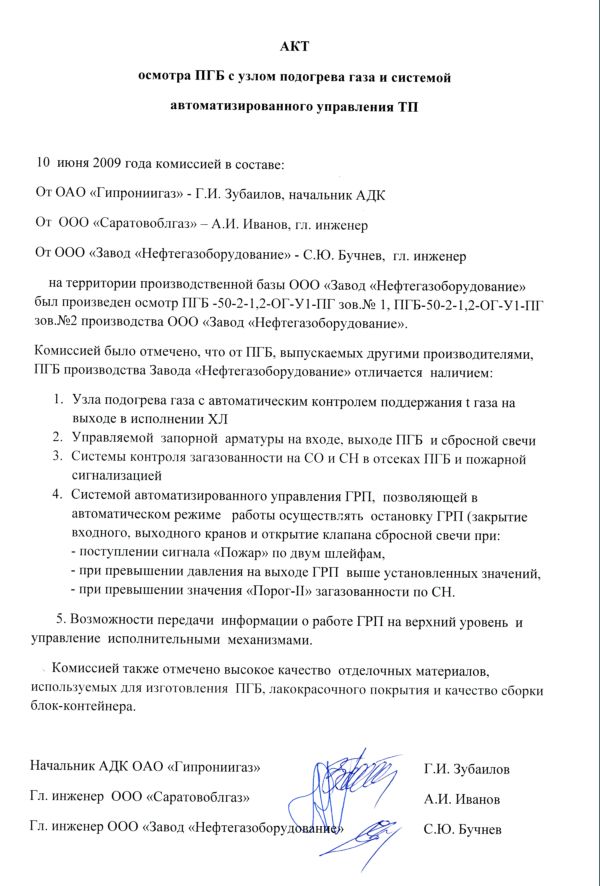 Ведущие специалисты ООО «Саратовоблгаз» и ОАО «Гипрониигаз» были ознакомлены с пунктом газорегуляторным блочным (ПГБ), ТУ 4859-003-55402257-2009 разработанным и изготовленным Заводом «Нефтегазоборудование». Специалисты особо отметили новизну технических и конструктивных решений, наличие возможности передачи информации на «верхний уровень» и дистанционного управления исполнительными механизмами, высокое качество сборки и современный внешний вид.
