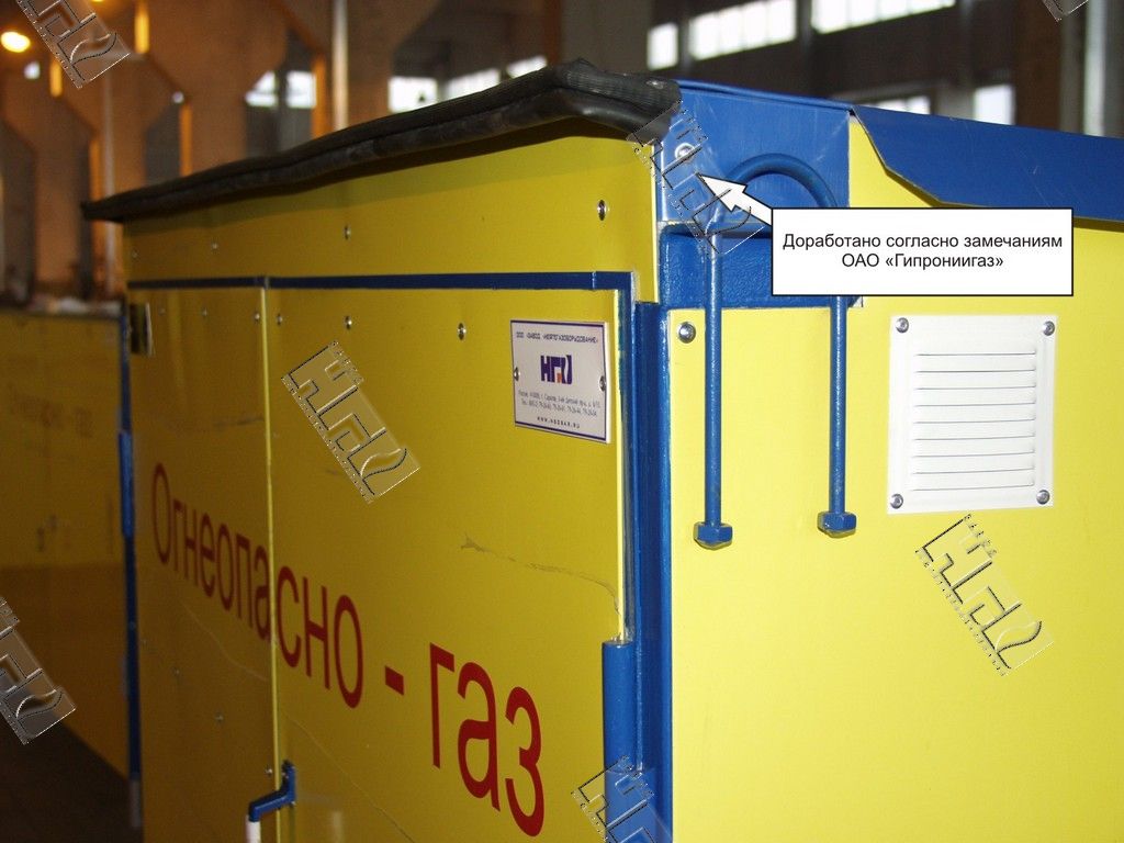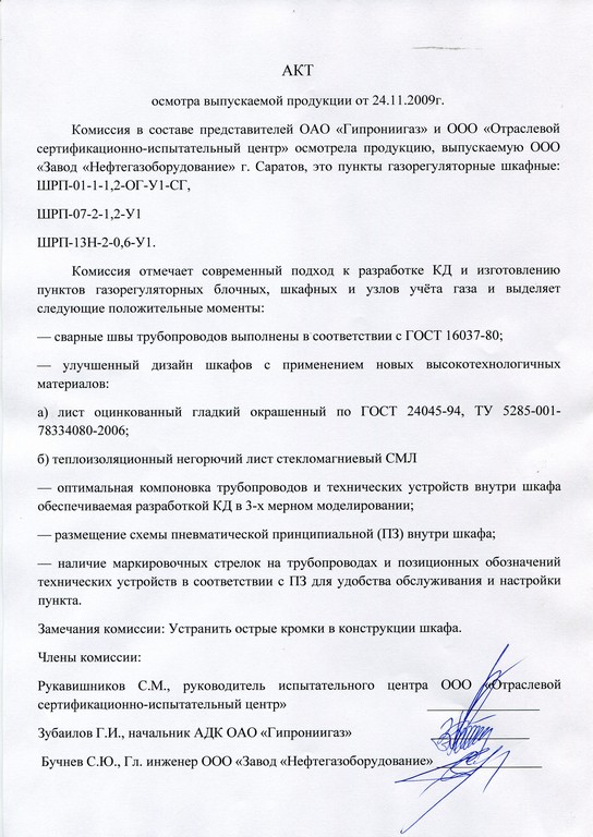 При осмотре представленных образцов серийного выпуска, Начальником АДК ОАО «Гипрониигаз» Зубаиловым Г.И., было высказано замечание по поводу острой кромки в конструкции крыши шкафа. После совещания технических служб завода данное замечание было устранено.