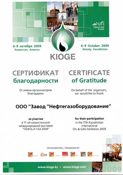 С 6 по 10 октября наш завод принял участие в 17-й Международной выставке «KIOGE-2009», которая проходила в г.Алматы (Республика Казахстан). Успех выставки растет с каждым годом, увеличивается количество участников и посетителей, что демонстрирует явный интерес ведущих фирм нефтегазовой отрасли к нефтегазовому сектору Казахстана. Участие в данной выставке является для нашего завода важным ежегодным мероприятием, позволяющим как установить новые деловые контакты, так и укрепить старые.
