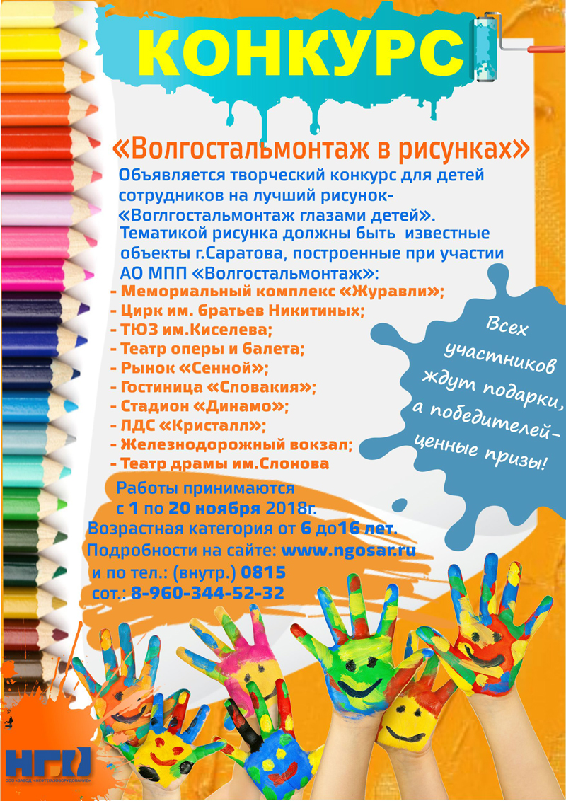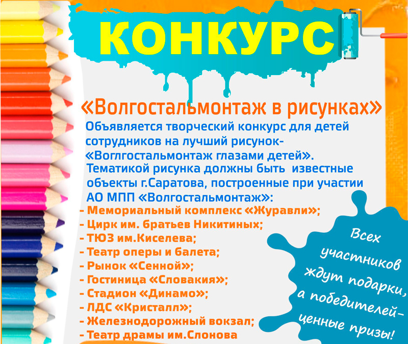 В рамках мероприятий, посвященных грядущему юбилею предприятия «Волгостальмонтаж», объявлен творческий конкурс для детей сотрудников от 6 до 16 лет. Для того, чтобы побороться за ценные призы, нужно нарисовать один из нижеперечисленных объектов архитектуры, в создании которого принимал участие СМУ «Волгостальмонтаж»: